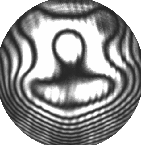 The polymer membrane deformable mirror technology is easily customized and scalable to up to 6″ diameters. The mirrors can be coated for reflectivity with virtually any metal coating. We are currently working on demonstrating multi-layer dielectric stack high reflectivity coatings. By leveraging printed circuit board technology for the actuators, we can quickly generate custom actuator patterns. The picture to the left is of the core of a typical 1″ diameter aluminum coated membrane deformable mirror (without its packaging).